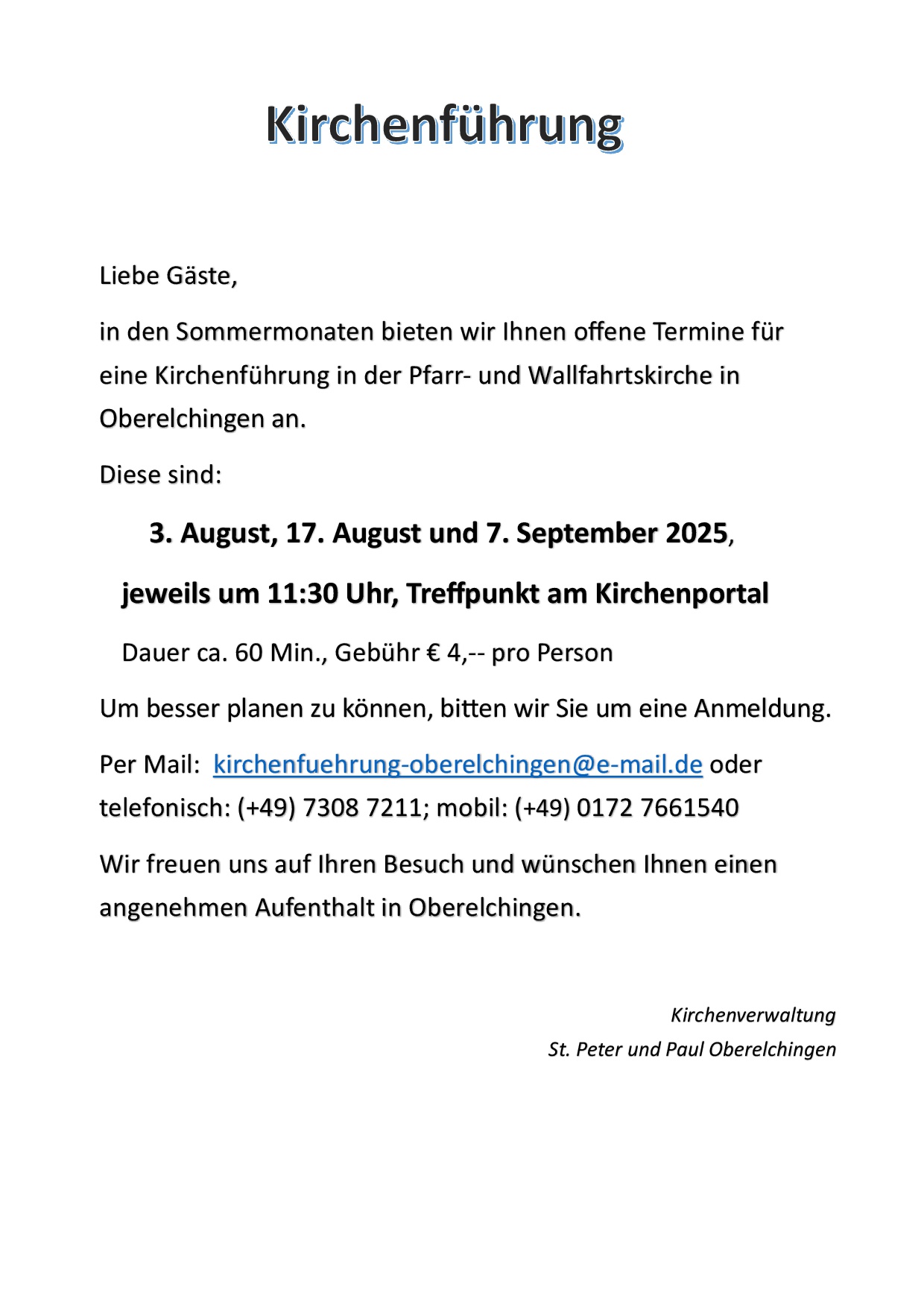 in den Sommermonaten bieten wir ihnen eine offene Führung der Klosterkirche Oberelchingen an.