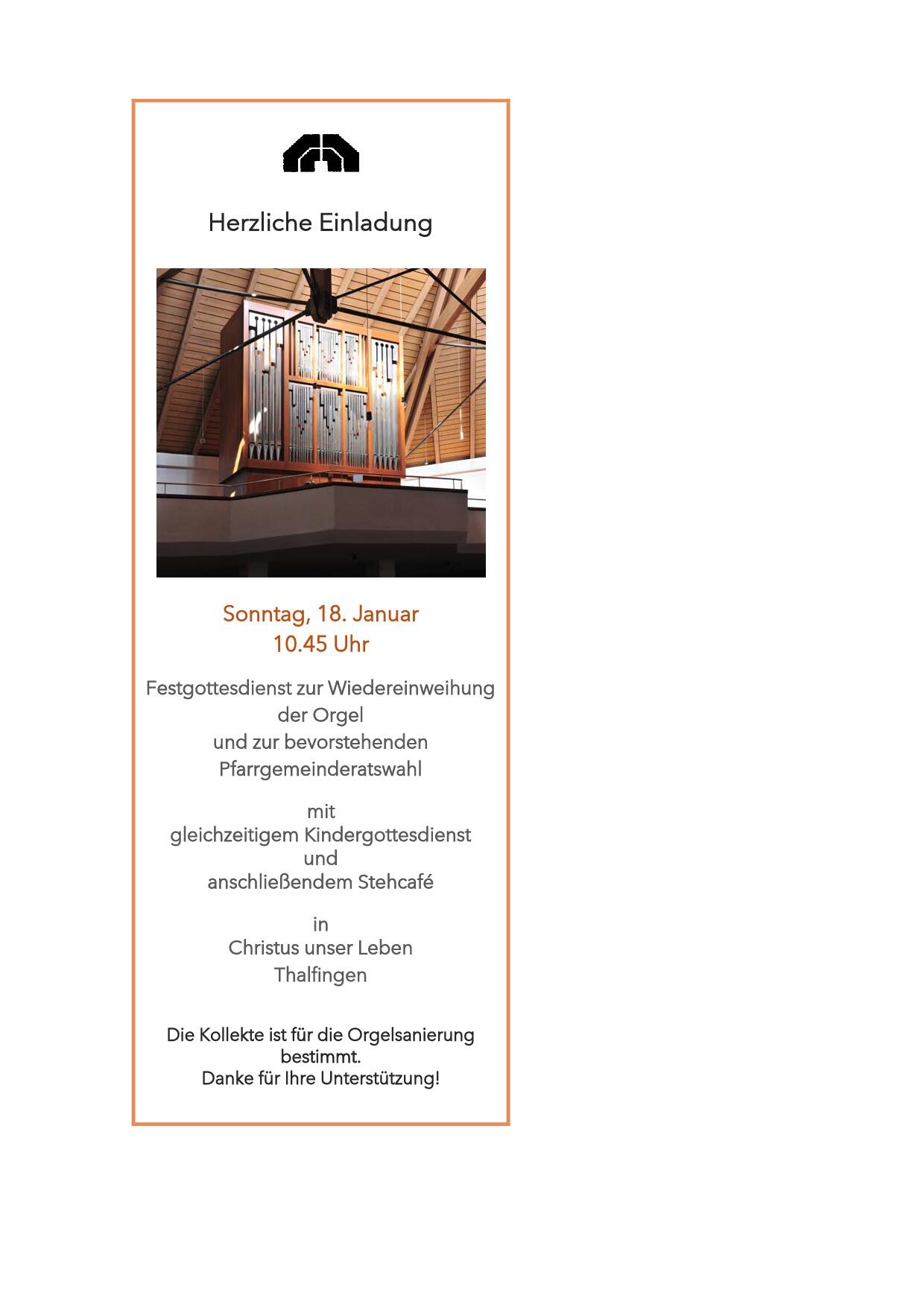 18 Jan ORGEL Wiedereinweihung Sonntag 18.01.2026 10:45 Uhr Festgottesdienst zur Wiedereinweihung der Orgel und zur bevorstehenden Pfarrgemeinderatswahl mit gleichzeitigem Kindergottesdienst und anschließendem Stehcafé Besondere Gottesdienste Veranstaltungsart Gottesdienst Zielgruppe Allgemein